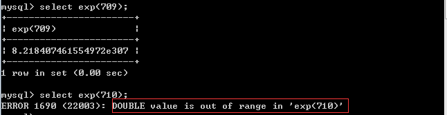 (1)MySQL exp(x)函数 返回e(自然对数的底)的x次方的值,但是这个数学函数有一个问题,那就是当传递一个大于709的值时,函数exp()就会引起一个溢出错误。