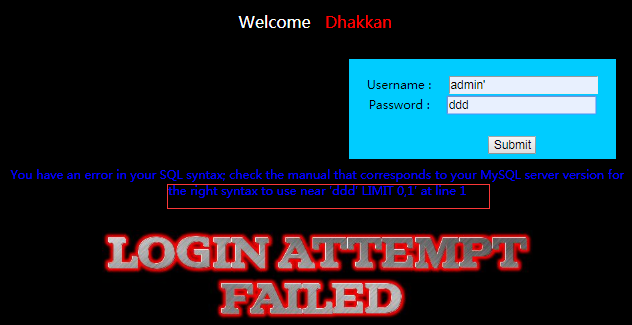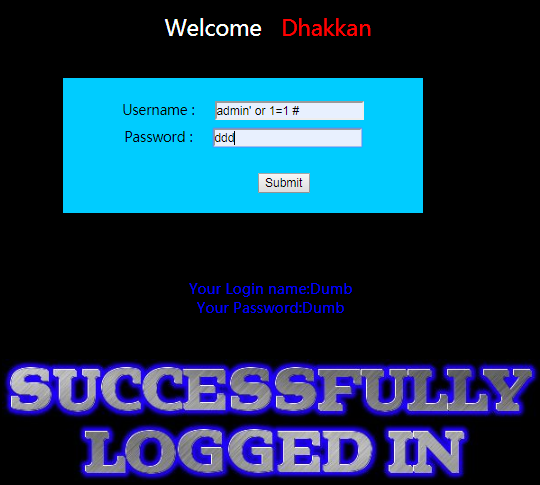 @$sql="SELECT username, password FROM users WHERE username='admin' or 1=1 #' and password='ddd' LIMIT 0,1";