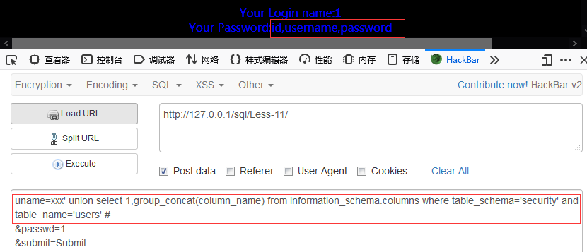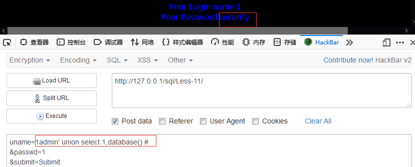 在#以后的内容就被注释掉,前面的内容因为or 1=1恒成立,所以语句就成立,我们此时以admin的用户登录。那么接下来我们尝试用get注入中用到的其他的语句代替or 1=1 进行注入。