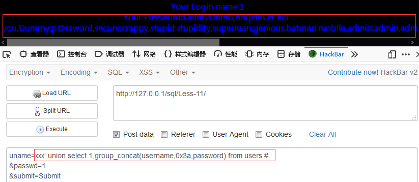 例如我们在less11中我们输入正确的用户名和密码后,显示