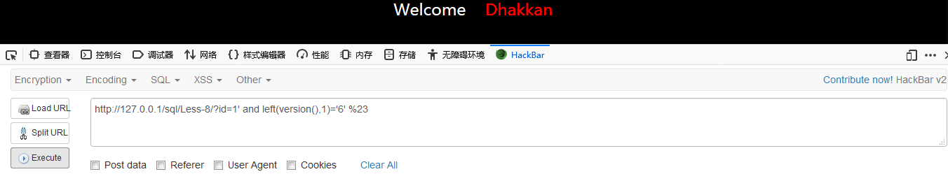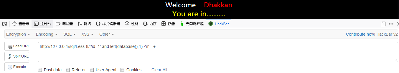 http://127.0.0.1/sql/Less-8/?id=1′ and left(database(),1)>’n’ –+