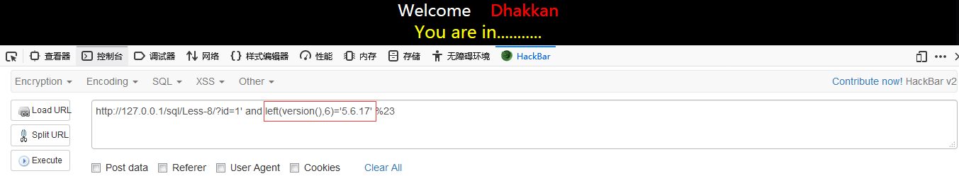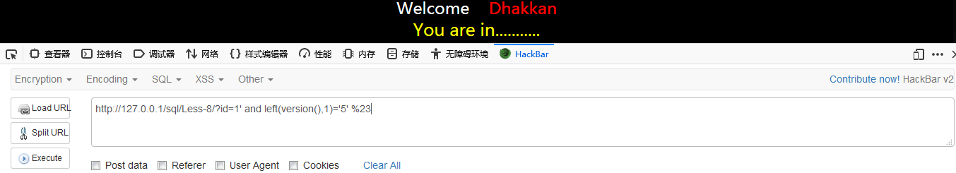 http://127.0.0.1/sql/Less-8/?id=1′ and left(version(),1)=’5′ %23