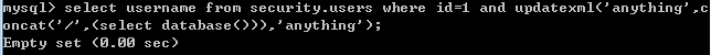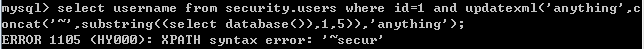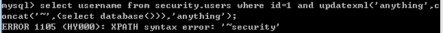 select username from security.users where id=1 and updatexml(‘anything’,concat(‘~’,(select database())),’anything’);