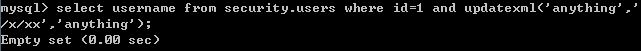 select username from security.users where id=1 and updatexml(‘anything’,’/x/xx’,’anything’);