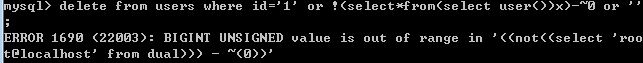 delete from users where id='1' or !(select*from(select user())x)-~0 or '';