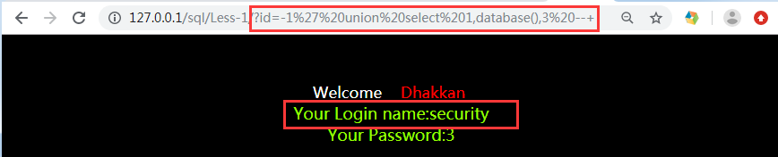 页面成功返回了数据库信息,得到数据库库名为security,如下图所示。