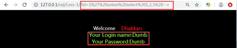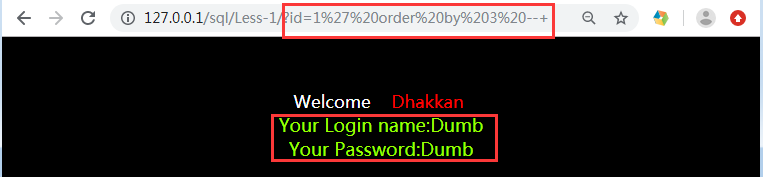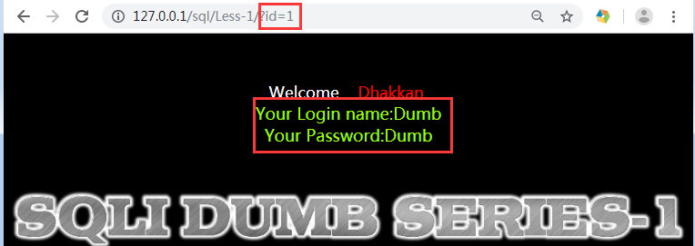 尝试在URL后添加?id=1回车,页面响应“Your Login name:Dumb Your Password:Dumb”。