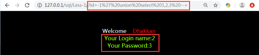 在数据库中查询参数ID对应的内容,然后将数据库的内容输出到页面。由于是将数据输出到页面上的,所以可以使用union注入,且通过order by查询结果,得到的字段数为3,所以union注入的语句如下:?id=1′ union select 1,2,3 –+