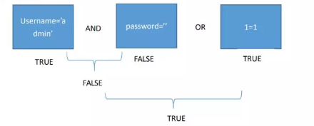 原因是在where子句后,我们可以看到三个条件语句 username=’admin‘ and password=”or 1=1。三个条件用and和or进行连接。在sql中,我们and的运算优先级大于or的运算优先级。因此可以看到 第一个条件(用a表示)是真的,第二个条件(用b表示)是假的,a and b = false,第一个条件和第二个条件执行and后是假,再与第三个条件or运算,因为第三个条件1=1是恒成立的,所以结果自然就为真了。因此上述的语句就是恒真了。