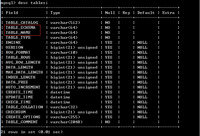 - TABLES表存储该用户创建的所有数据库的库名和表名,我们需要记住该表中记录数据库库名和表名的字段名分别为TABLE_SCHEMA和TABLE_NAME。