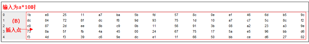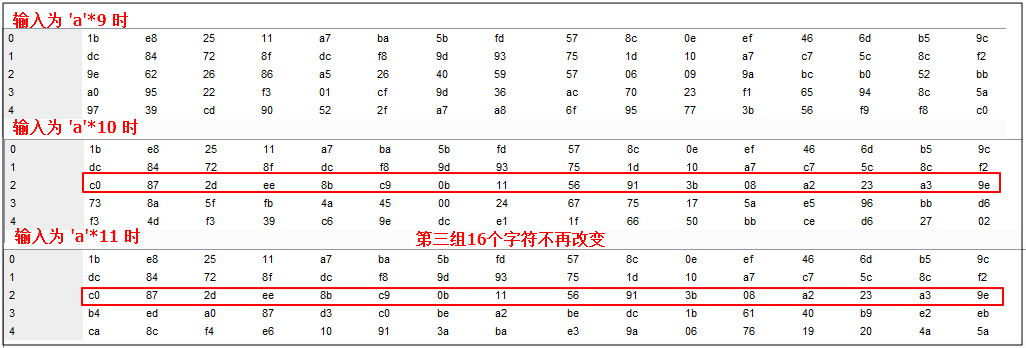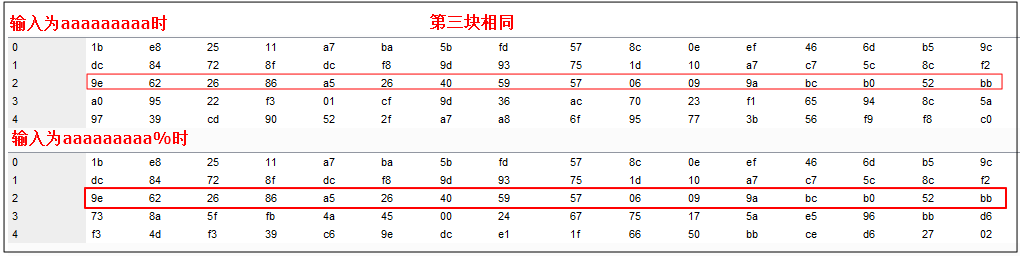接着输入【aaaaaaaaaa】(10个字节正好补齐第三块)得到加密字节(设为B)如下: