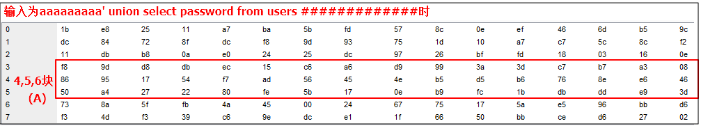 由于服务器端会先将输入的’转义为\’,然后再进行ECB加密,所以上面加密字节中间部分加密的其实是【aaaaaaaaa\’ union select password from users #############】,由于【aaaaaaaaa\】是10个字节,正好补齐了第3块,而【’ union select password from users #############】正好是48个字符,所以加密字节中的第4,5,6块正好是其加密后的值(设为A)。