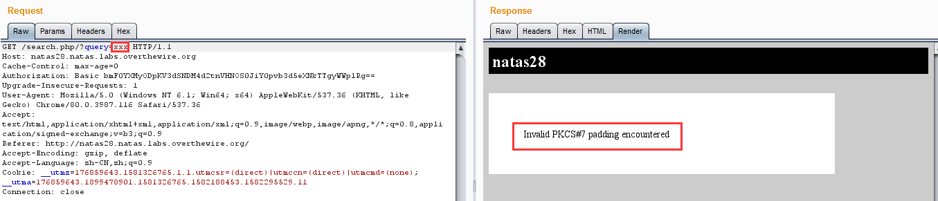 我们尝试修改get请求中query的值,返回报错信息:Invalid PKCS#7 padding encountered。说明此处的加密使用了PKCS7Padding填充模式。